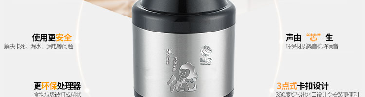DCLQ40-廚房垃圾處理器,該機是一種現代化的廚房電器,它用全新的方法來處理現代家庭中的食品廢物。處理器裝于廚房水槽下,能夠有效地將食物垃圾研磨成細小顆粒,直接從下水管道排出,從而輕松實現及時方便快捷的廚房清潔,優化家居環境。