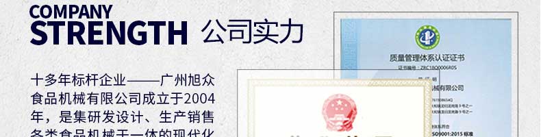 廣州旭眾食品機(jī)械有限公司是一家集科研開(kāi)發(fā),生產(chǎn)設(shè)計(jì),營(yíng)銷服務(wù)為一體的現(xiàn)代化生產(chǎn)企業(yè)。現(xiàn)代化生產(chǎn)車間,精湛制造技術(shù),所產(chǎn)機(jī)械歷經(jīng)市場(chǎng)重重考驗(yàn),不斷贏得海內(nèi)外客戶的贊譽(yù)。